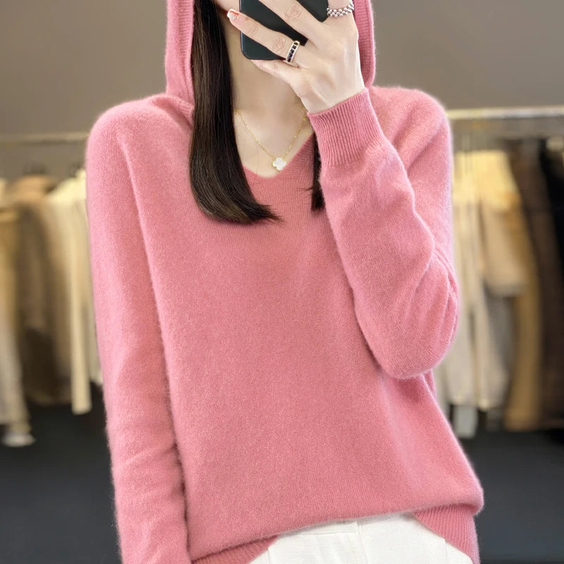 The Elvoria Hood is crafted from 100% pure merino wool, offering gentle warmth, exceptional softness and breathable comfort throughout autumn and winter. With its refined V-neckline and cozy hood, it blends the ease of casual wear with the timeless elegance women love — perfect for quiet days at home, relaxed outings or layering under your favourite winter coat.